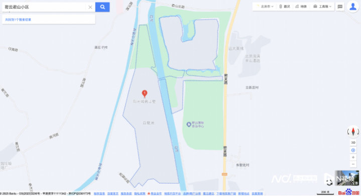 君山小区地处北京市密云区。开发商官网描述:项目地处密云生态涵养区,周边云蒙山、云佛山、燕山三山环抱,白河、京密引水渠两水环绕,密云水库及高达45%的绿化率,让这里成为北京难得的低密山水墅区。公开资料显示,小区从2007年开始交付,并不断建设最终形成了今天的规模。白河从小区中穿过,将其分为东西两部分,最早开工建设的东区为美式建筑风格,此后建设的西区为西班牙式建筑。